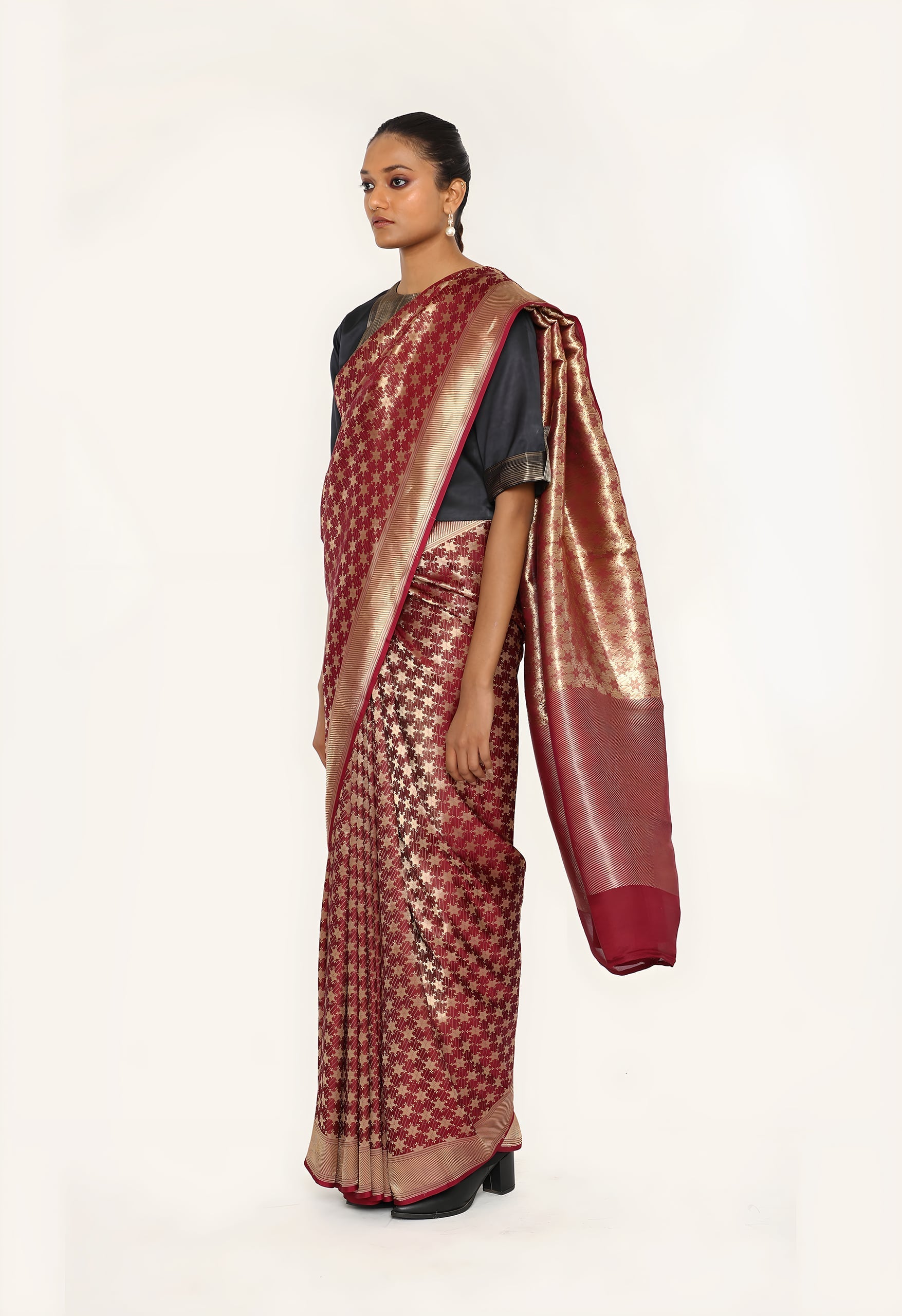 Weaving Technique: Fekwa, a specialized Banarasi technique featuring intricate patterns woven with metallic zari.