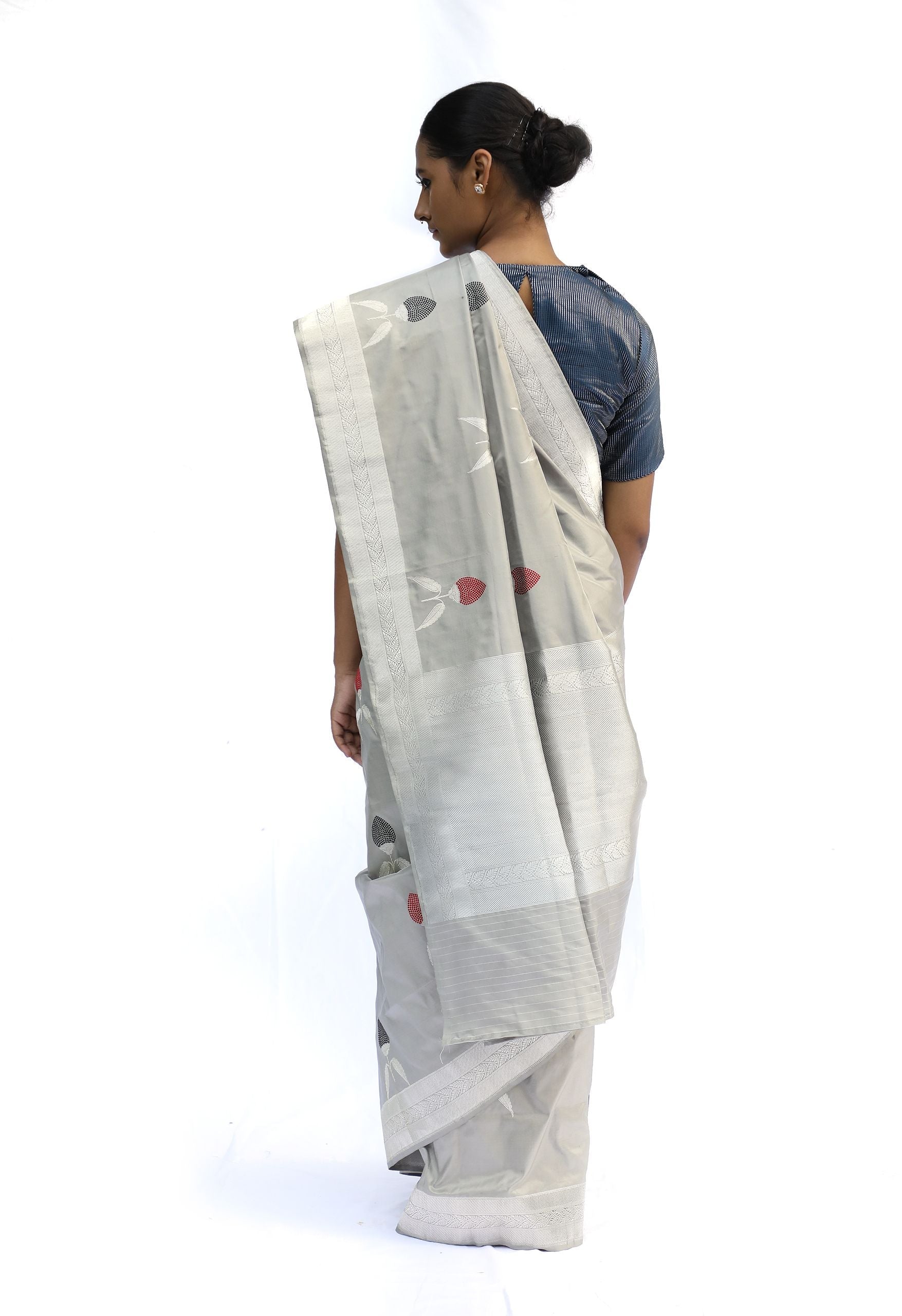 MALAR a katan silk saree with spaced out indigenous floral resham and meenakari boota. The saree sets into unusual color palette that complements the richness of the silk and enhances the allure of the floral bootas. The saree is woven in traditional kadwa technique where each motif is woven separately.