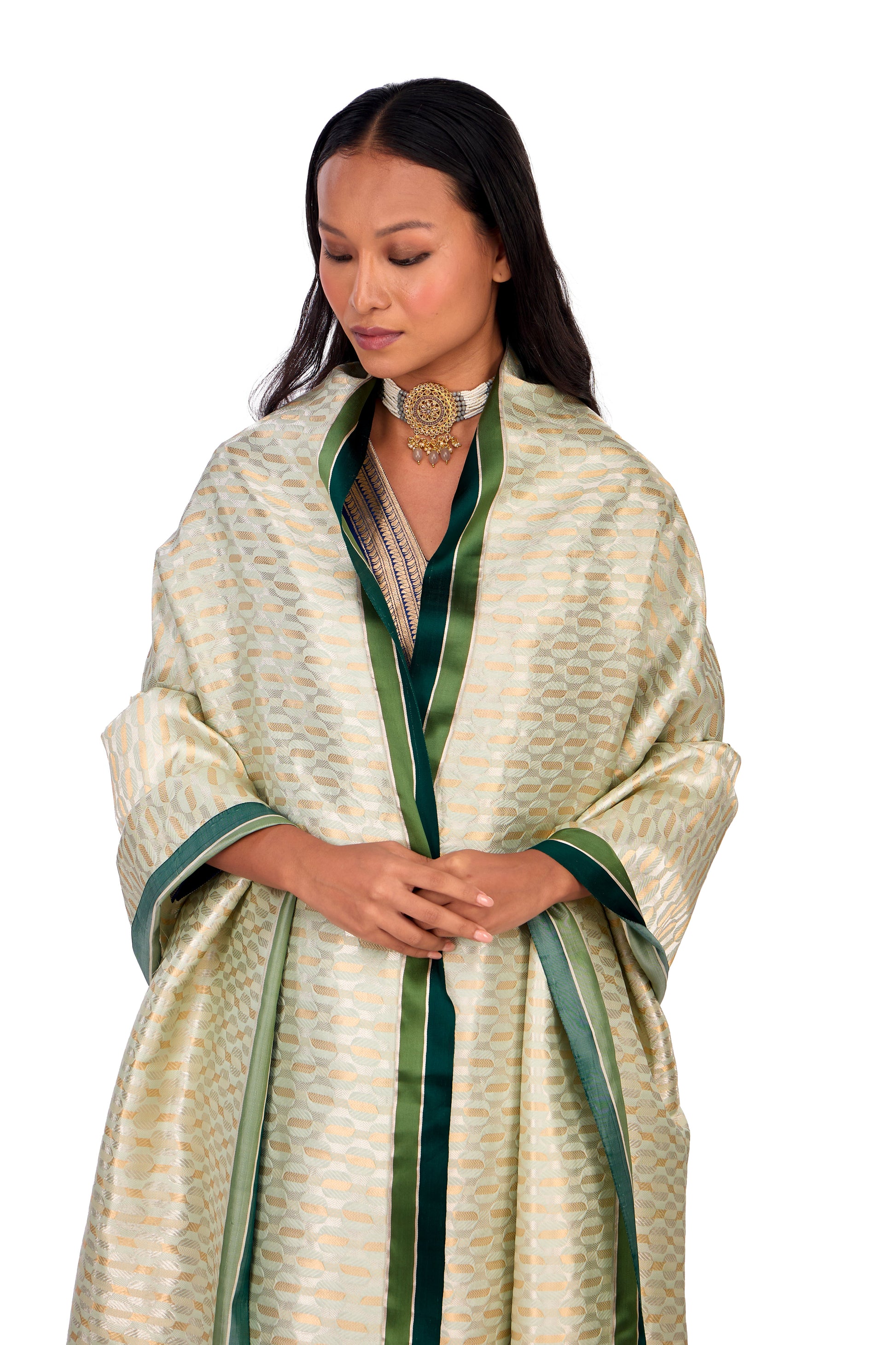A luxurious katan silk dupatta featuring a stunning mashru border. The mashru silk, known for its intricate weave and lustrous finish