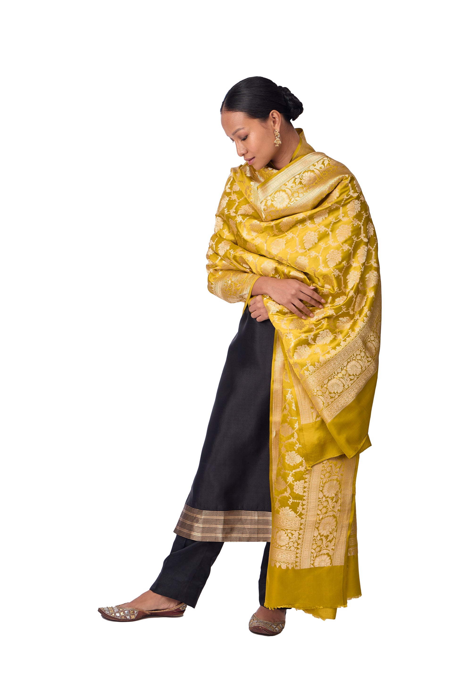 Satin Jaal Dupatta, The border is adorned with shimmering gold zari thread, adding a touch of elegance.