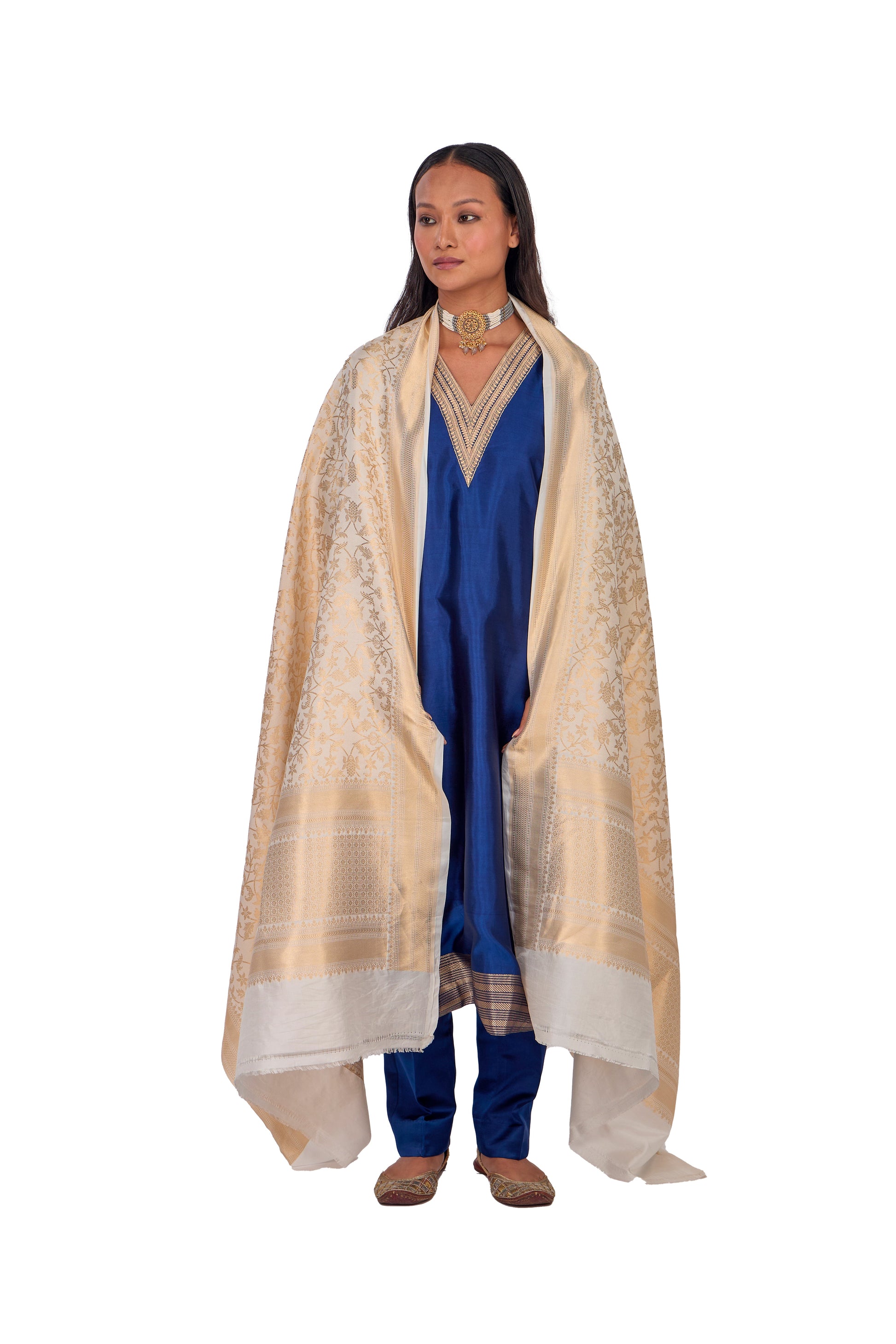 luxurious silk dupatta adorned with ambose motif, a traditional Indian floral design. The intricate gold zari border adds a touch of elegance