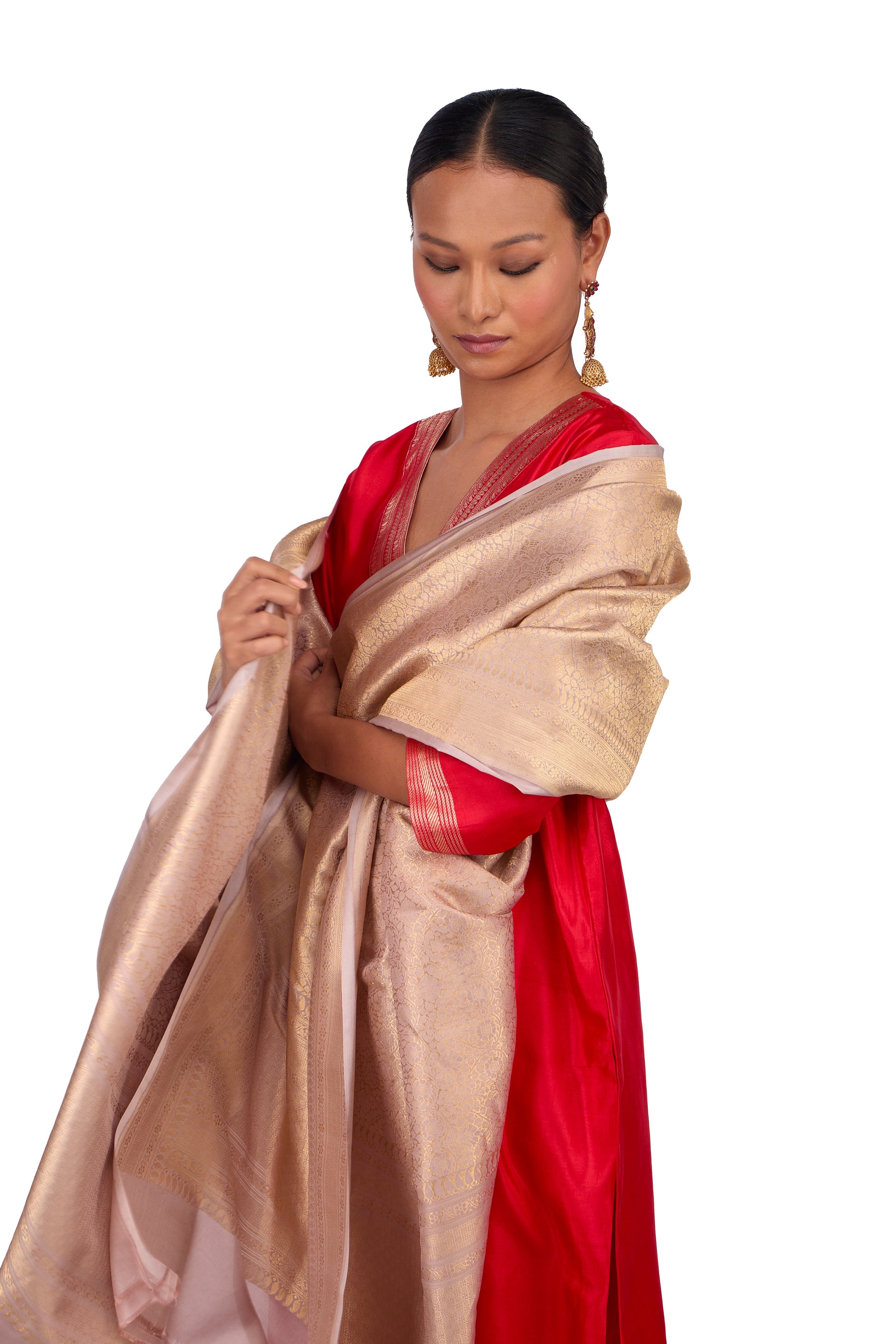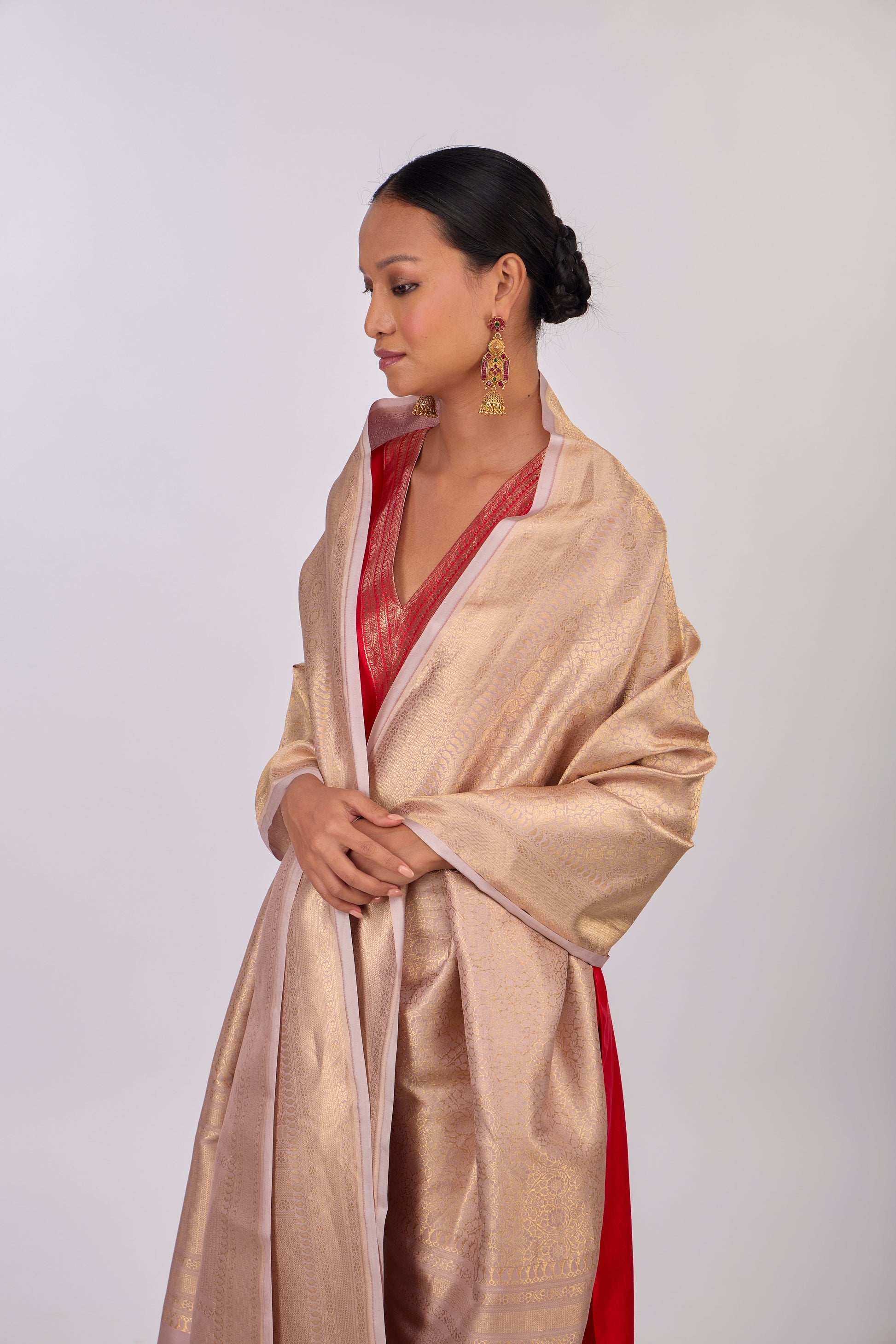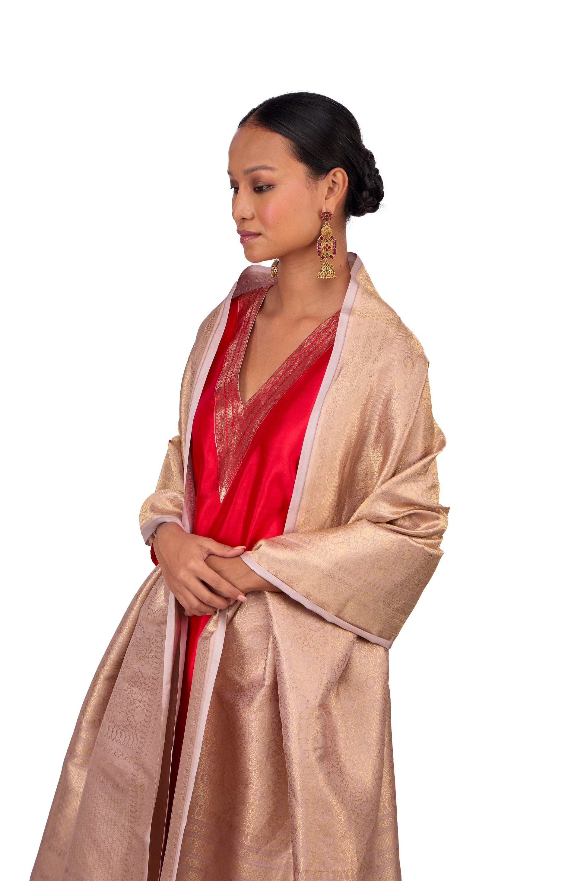 Katan silk Dupatta with all over floral emboss pattern. The inlay draws inspiration from the age-old floral patterns and motifs of Indian textile.