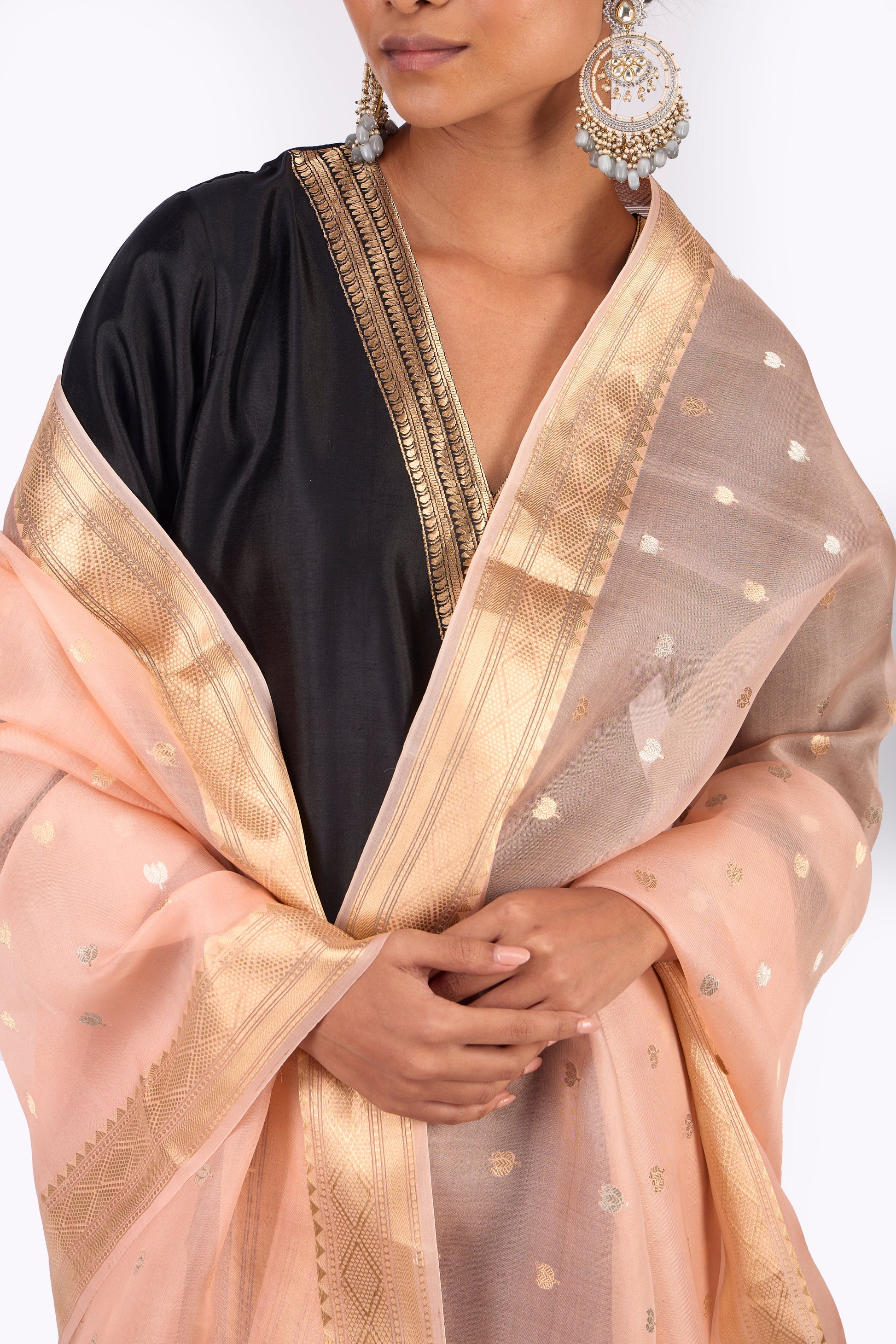 Delicate organza dupatta adorned with a beautiful mogra booti pattern. The intricate kadwa embroidery adds depth and texture, while the shimmering gold zari border provides a touch of elegance.
