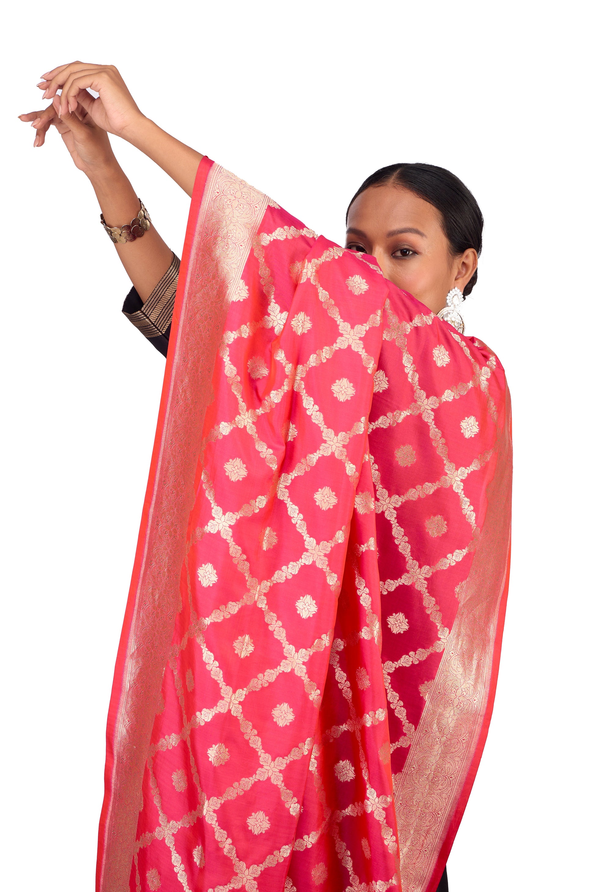Katan silk Jaal Dupatta with all over floral boota and jaal pattern draws inlay from the Mughal era.