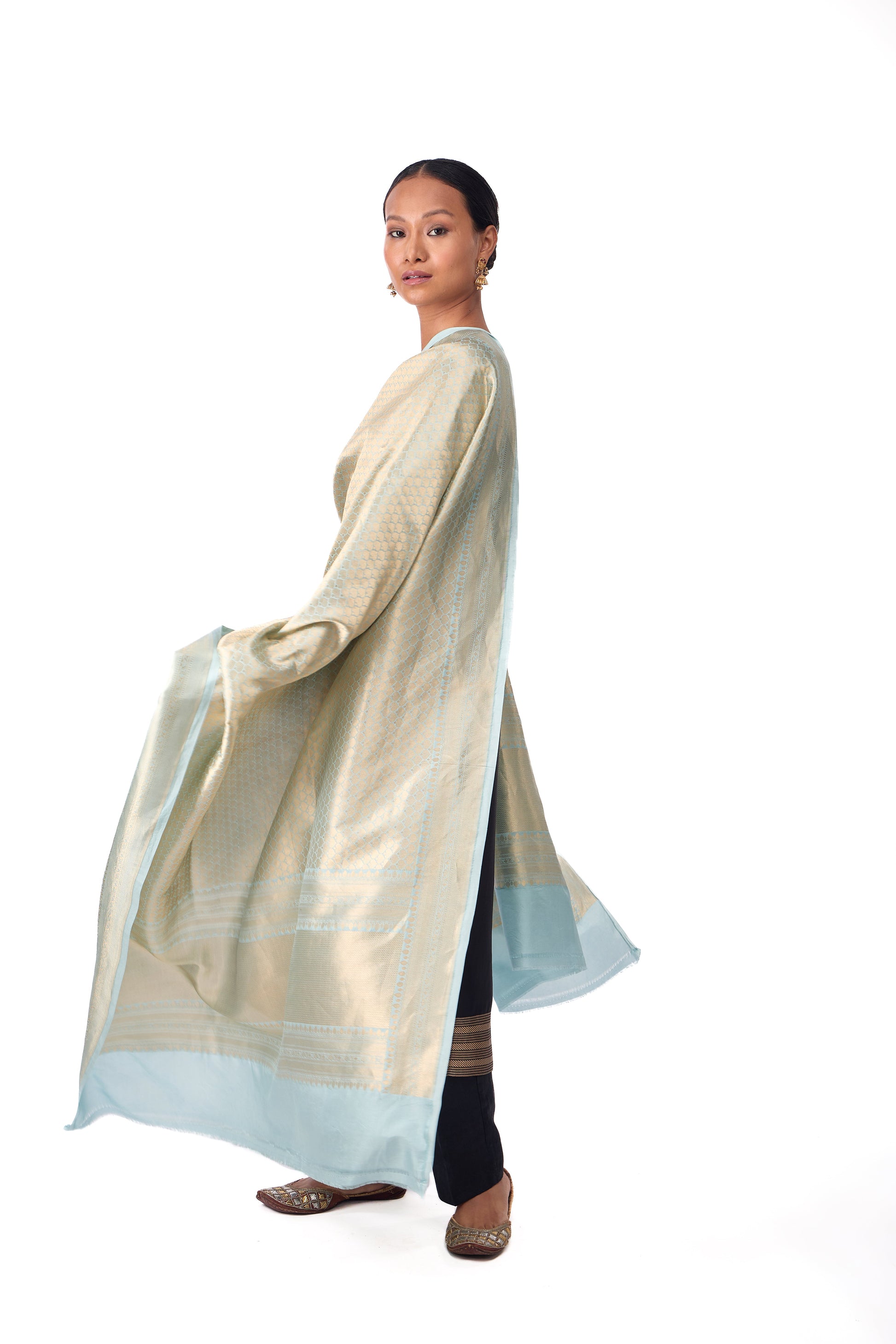 A luxurious katan silk dupatta adorned with a delicate ambose motif, a traditional Indian floral design