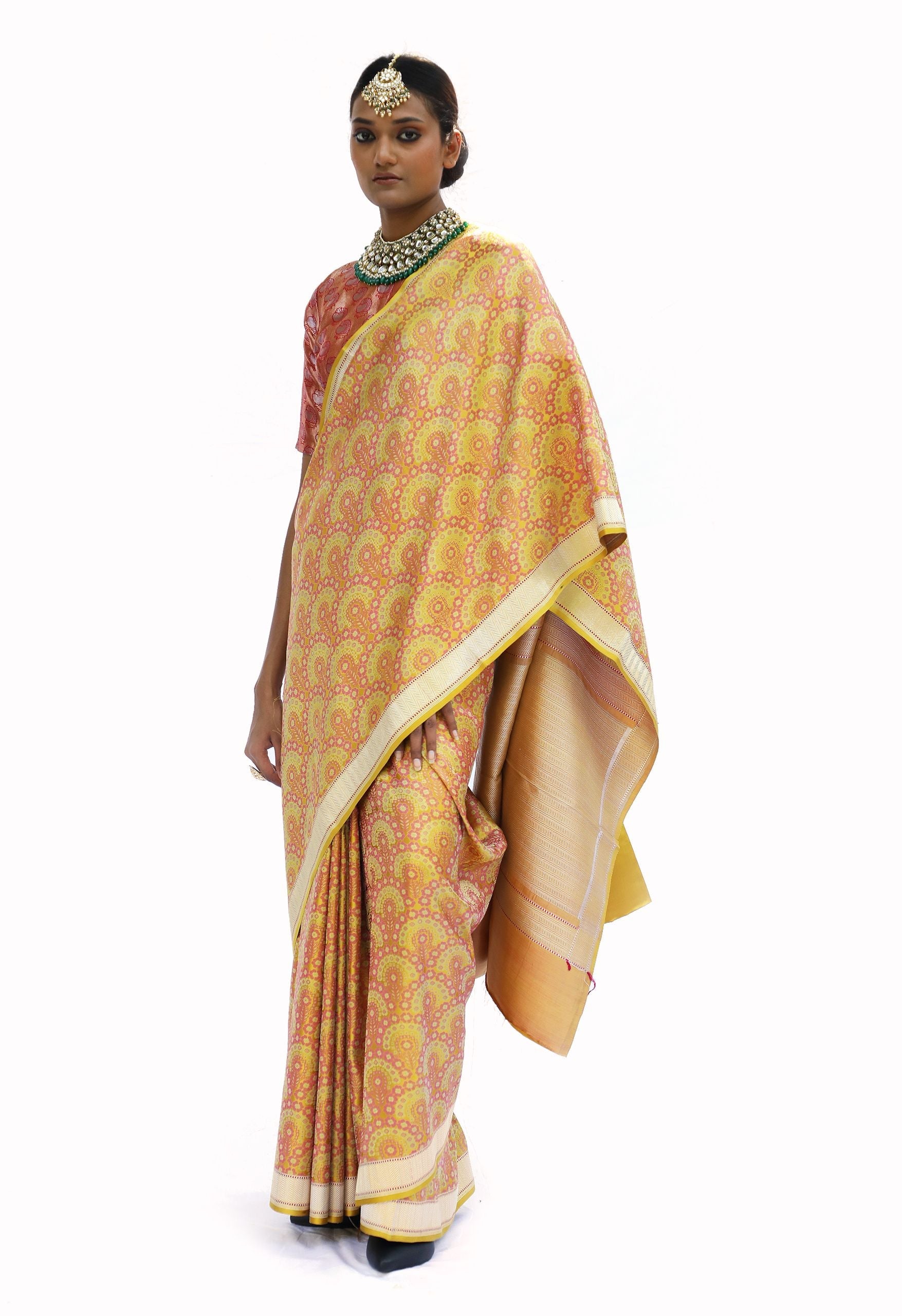 SRISHA a katan silk saree inspired by the wild flower motifs all over. Woven in khadwa technique where each motifs is woven seperately.